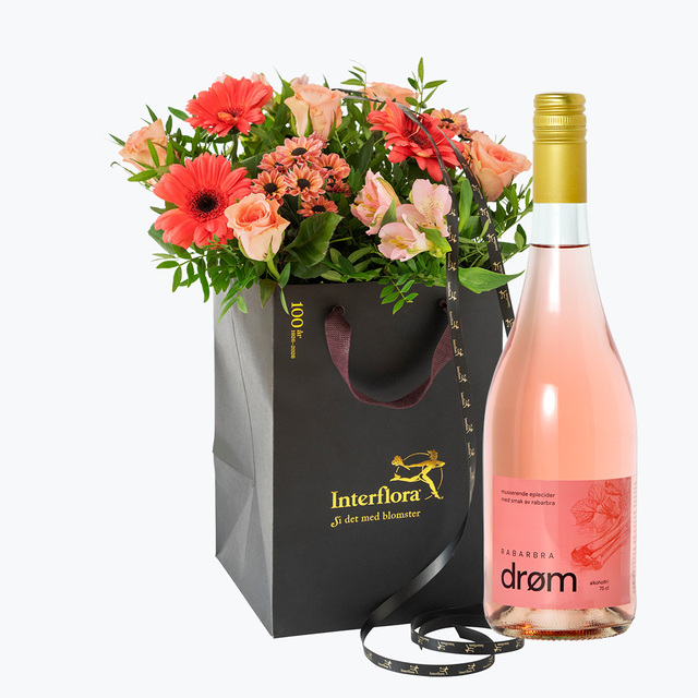 En delikat bukett av kjente blomstersorter som roser, alstromeria, germini og krysantemum. Gi bort «Stor klem» når du vil glede eller vise omtanke. Leveres med en flaske deilig musserende cider med smak av rabarbra.